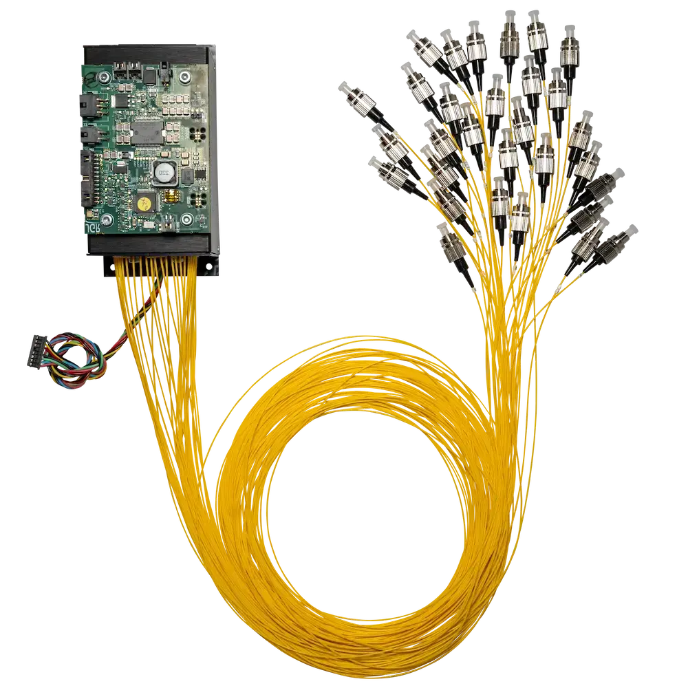 The smallest form factor OSX-100E (90x42x40mm) can fit in a conventional 1U module chassis and has up to 27 channels. The compact configuration of the OSX-100E combined with the standard I2C communication protocol allows for a simple and flexible integration.