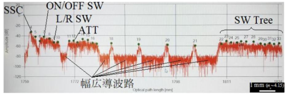 使用SPA-100,研究人员能够获得以前无法获得的有关设备内部结构的细节。经过分析,SPA-100 揭示了器件内部的高杂散反射点,这些反射点之间的间隔约为 6.5mm。 发现这些反射点对应于位于具有锯齿形波导的电路部分上的紧密波导弯曲。