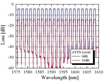 Figure 9 shows arbitrary spectra. The pixel pitch, width and number of LCOS chip are 5 μm, 4.7 μm and 2560 μm, respectively. And 12 bit level of LC driving voltage makes high spectrum control resolution possible.