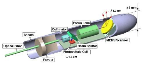 Recently, we have also been applying our MEMS technology to create components for medical imaging applications. Figure 3 shows the design of our endoscopic probe that uses a MEMS scanning mirror to scan a laser beam and capture an image. Combined with Santec’s OCT technology, this device is being applied to gastrointestinal and urological imaging as an alternative to biopsies in the detection of cancer and other diseases.